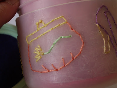 * Plastic container- this can really be any type of container. Even the clear deli take-out kind will work, (although I have a different method for that kind, I'll share with you later.) you just have to be more conscious of your jump stitches.